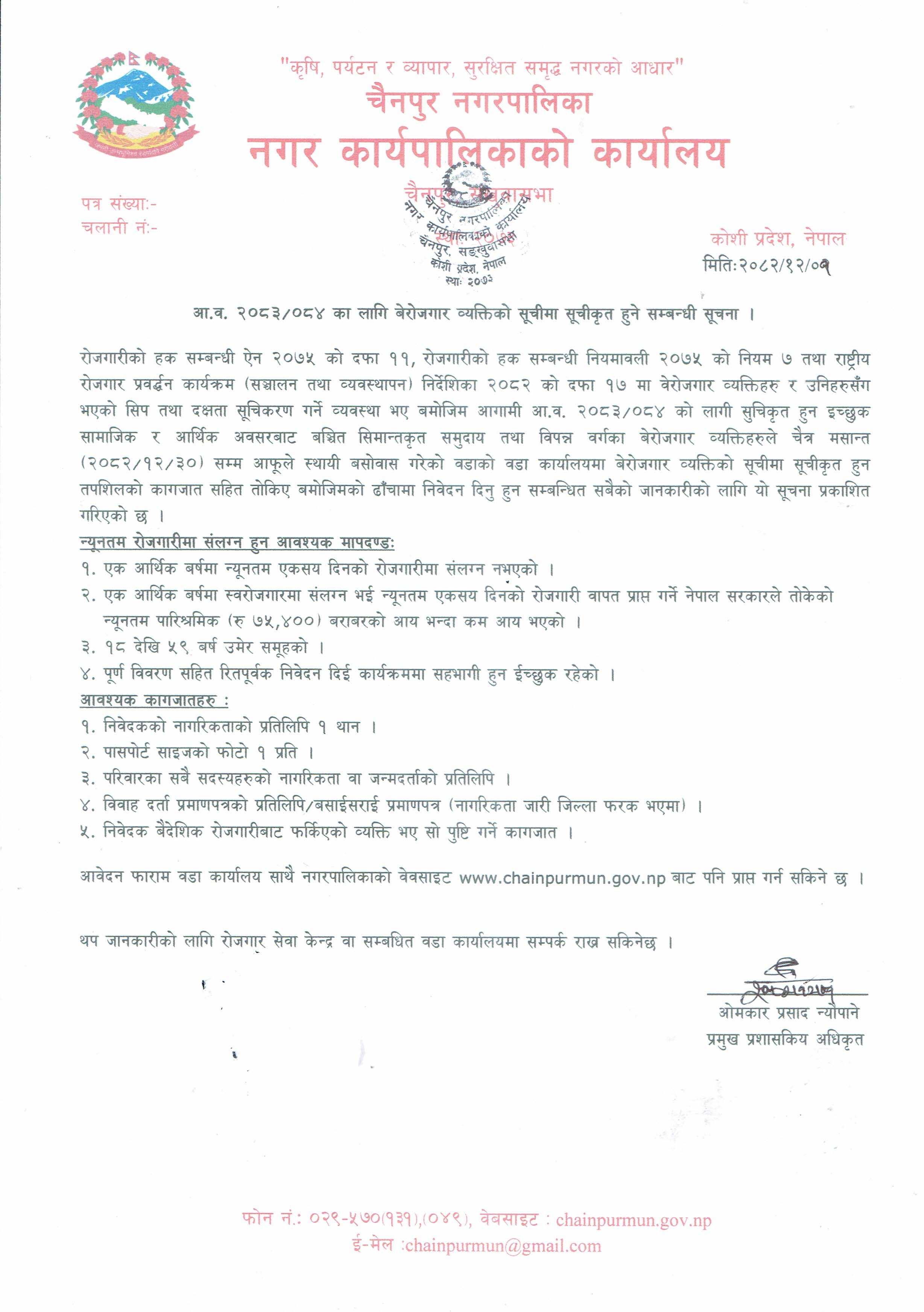 आ.व. २०८३-०८४ का लागि बेरोजगार व्यक्तिको सूचीमा सूचीकृत हुने सम्बन्धी सूचना